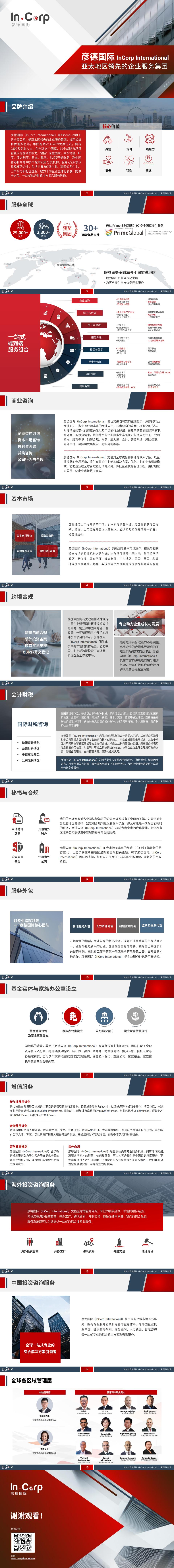 彦德国际InCorp International是Ascentium旗下的全资公司,是亚洲地区具有领先地位的企业服务集团,设新加坡和香港双总。集团有超过30年的发展历史,拥有2300名专业人士,在全球14个国家,19个战略市场具有强大的区域影响力,包括:东盟国家、中东地区、印度、澳大利亚、日本、韩国、BVI和开曼群岛,及中国香港和內地10多个城市设有分支机构,服务20000+家较具规模的企业,包括世界500强企业、跨国知名企业、上市公司和初创企业,致力于为企业全球化发展,提供全方位、一站式综合性解决方案和服务咨询。