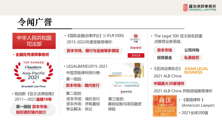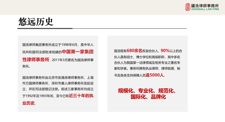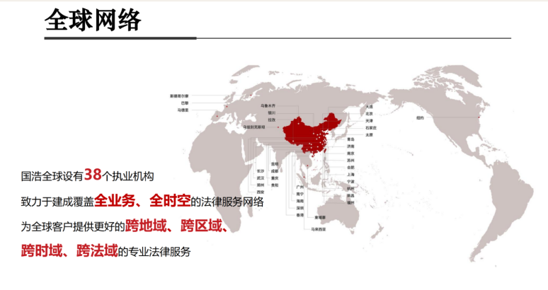 国浩律师事务所是在司法部登记注册的中国第一家集团律师事务所,开创了中国律师业规模化、专业化、规范化、国际化、品牌化之先河,目前在全球设有38个执业机构,涵盖北京、上海、深圳、杭州、广州、昆明、天津、成都、宁波、福州、西安、南京、南宁、济南、重庆、苏州、长沙、太原、武汉、贵阳、乌鲁木齐、郑州、石家庄、合肥、海南、青岛、南昌、大连、银川、拉孜、香港、巴黎、马德里、斯德哥尔摩、纽约、乌兹别克斯坦、柬埔寨、马来西亚。其于2017年7月发起设立的“一带一路”法律服务协作体,成员为来自20多个国家和地区的近40家律师事务所;2019年10月与西班牙ECIJA律师事务所签订战略合作协议,法律服务网络延伸至拉美诸国。